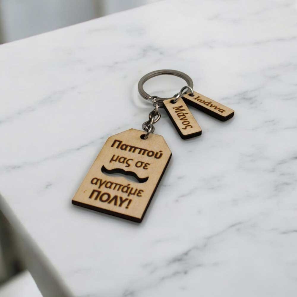 Ξύλινο προσωποποιημένο μπρελόκ σε σχήμα ετικέτας με χαραγμένη την αφιέρωση "Παππού μας σε αγαπάμε πολύ".