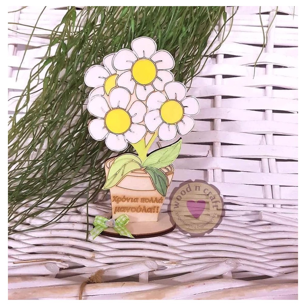Ξύλινο γλαστράκι με μαργαρίτες - Χρόνια πολλά μανούλα