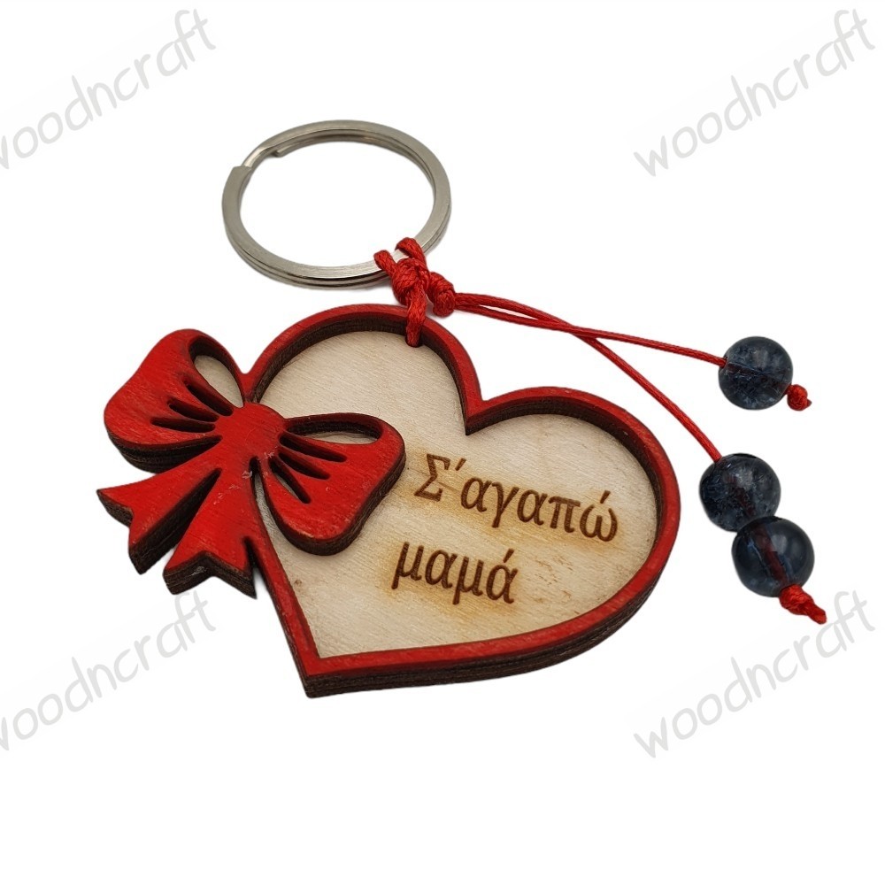 Ιδιαίτερο ξύλινο χειροποίητο μπρελόκ σε σχήμα καρδιάς με προσαρμοσμένο ένα φιογκάκι και χάραξη Σ'αγαπώ μαμά! Βαμμένο και διακοσμημένο με χάντρες.