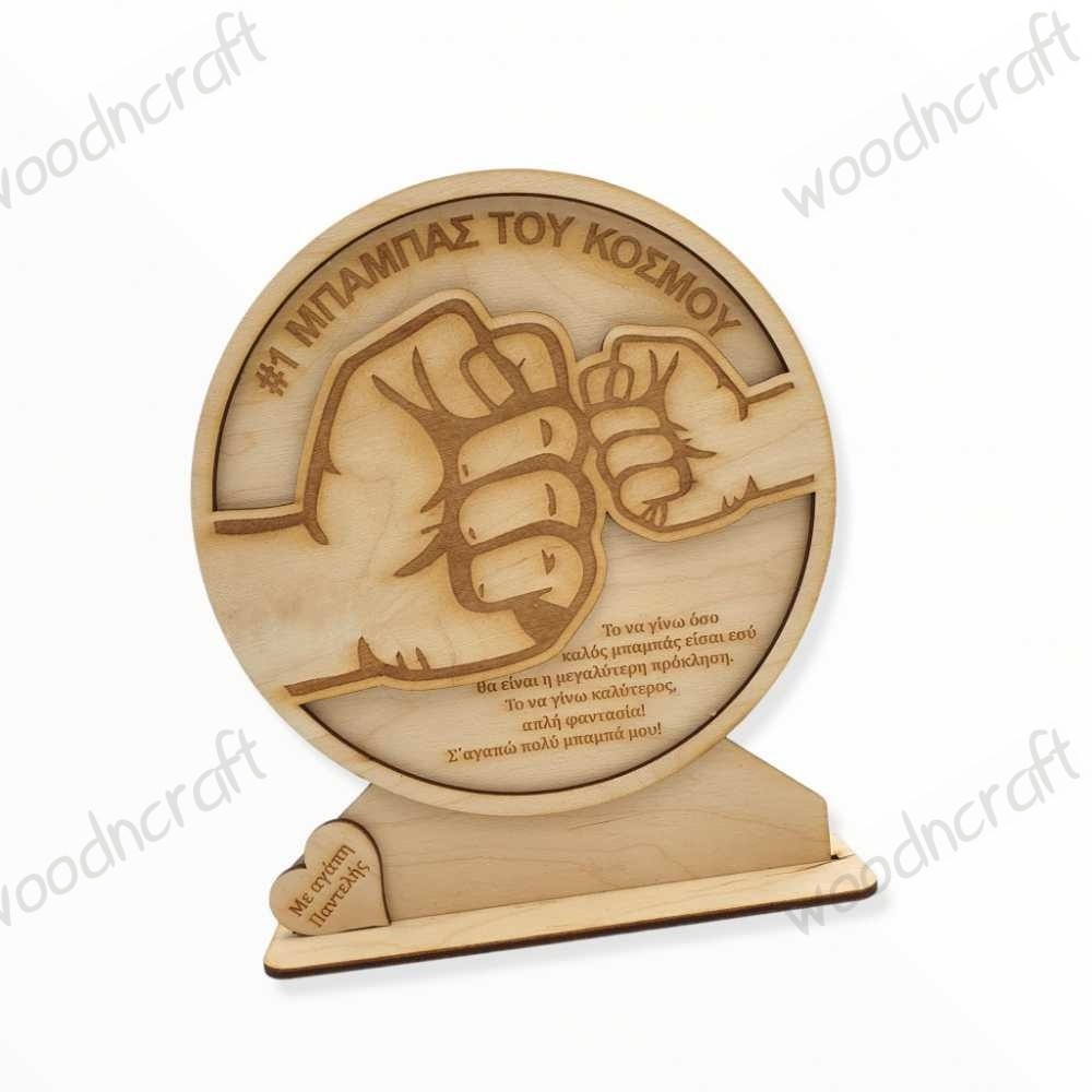 Ξύλινο χειροποίητο διακοσμητικό σταντάκι, υπέροχο δώρο για τον καλύτερο μπαμπά του κόσμου! Το σχέδιο αναπαριστά την γροθιά του μπαμπά να ενώνεται με του παιδιού του, από πάνω ακριβώς υπάρχει χαραγμένη η φράση "#1 μπαμπάς του κόσμου" και από κάτω χαραγμένη η αφιέρωση της επιλογής σας. Προσωποποιημένο με μία καρδούλα με το όνομα της επιλογής σας.