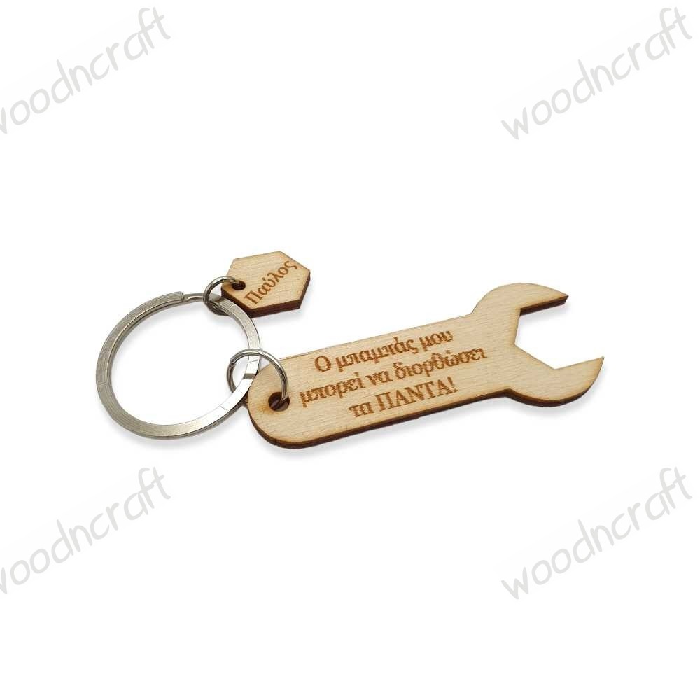 Ξύλινο μπρελόκ σε σχέδιο γαλλικό κλειδί με χαραγμένη αφιέρωση "Ο μπαμπάς μου μπορεί να διορθώσει τα πάντα". Φτιαγμένο με μεταλλικό κρίκο και αλυσιδάκι ασημί χρώματος και προσωποποιημένο με το όνομα της επιλογής σας!