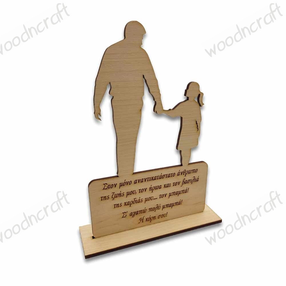 Ξύλινο χειροποίητο διακοσμητικό σταντάκι, υπέροχο δώρο για τον καλύτερο μπαμπά του κόσμου! Στην πάνω πλευρά φαίνεται ο πατέρας να περπατάει χέρι-χέρι με την κόρη του και από κάτω ακριβώς υπάρχει χαραγμένη αφιέρωση της επιλογής σας.
