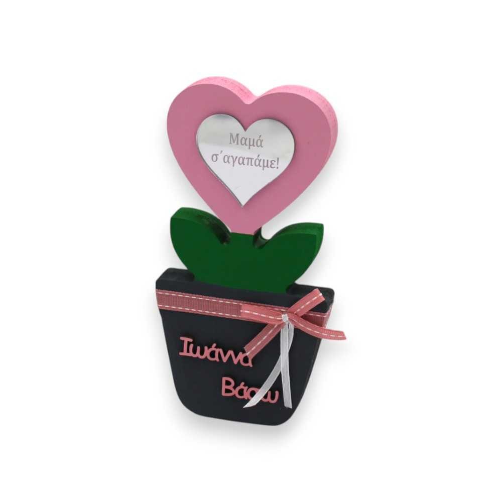 Ξύλινο χειροποίητο αυτοστηριζόμενο διακοσμητικό σε σχέδιο γλαστράκι με λουλούδι σε σχήμα καρδούλας. Βαμμένο στο χέρι, διακοσμημένο με κορδελάκια και καρδούλα από ασημί καθρέφτη πλεξιγκλάς χαραγμένη με αφιέρωση "Μαμά σ' αγαπάμε". Τέλος το γλαστράκι είναι προσωποποιημένο με τα ονόματα των παιδιών καθιστώντας το ένα μοναδικό δώρο που θα μείνει αξέχαστο!