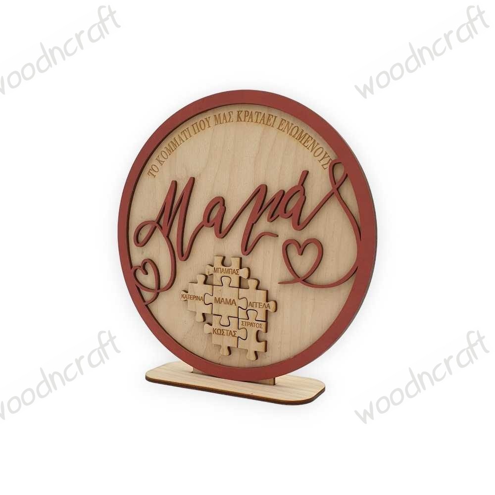 Ξύλινο χειροποίητο διακοσμητικό σε στρόγγυλο σχήμα, στηριζόμενο σε βάση και αφιερωμένο στη μαμά. Το στρόγγυλο περίγραμμα όπως και η λέξη μαμά που βρίσκεται προσαρμοσμένη στο κέντρο του διακοσμητικού, βάφονται σε όποιο χρώμα προτιμάτε έτσι ώστε να ταιριάζει με τον χώρο που θα διακοσμηθεί. Πάνω από την λέξη μαμά υπάρχει χαραγμένη η αφιέρωση "το κομμάτι που μας κρατάει ενωμένους" ενώ κάτω από την λέξη μαμά υπάρχουν κομμάτια παζλ χαραγμένα με τα ονόματα της υπόλοιπης οικογένειας και ενωμένα με το κεντρικό κομμάτι που γράφει μαμά.