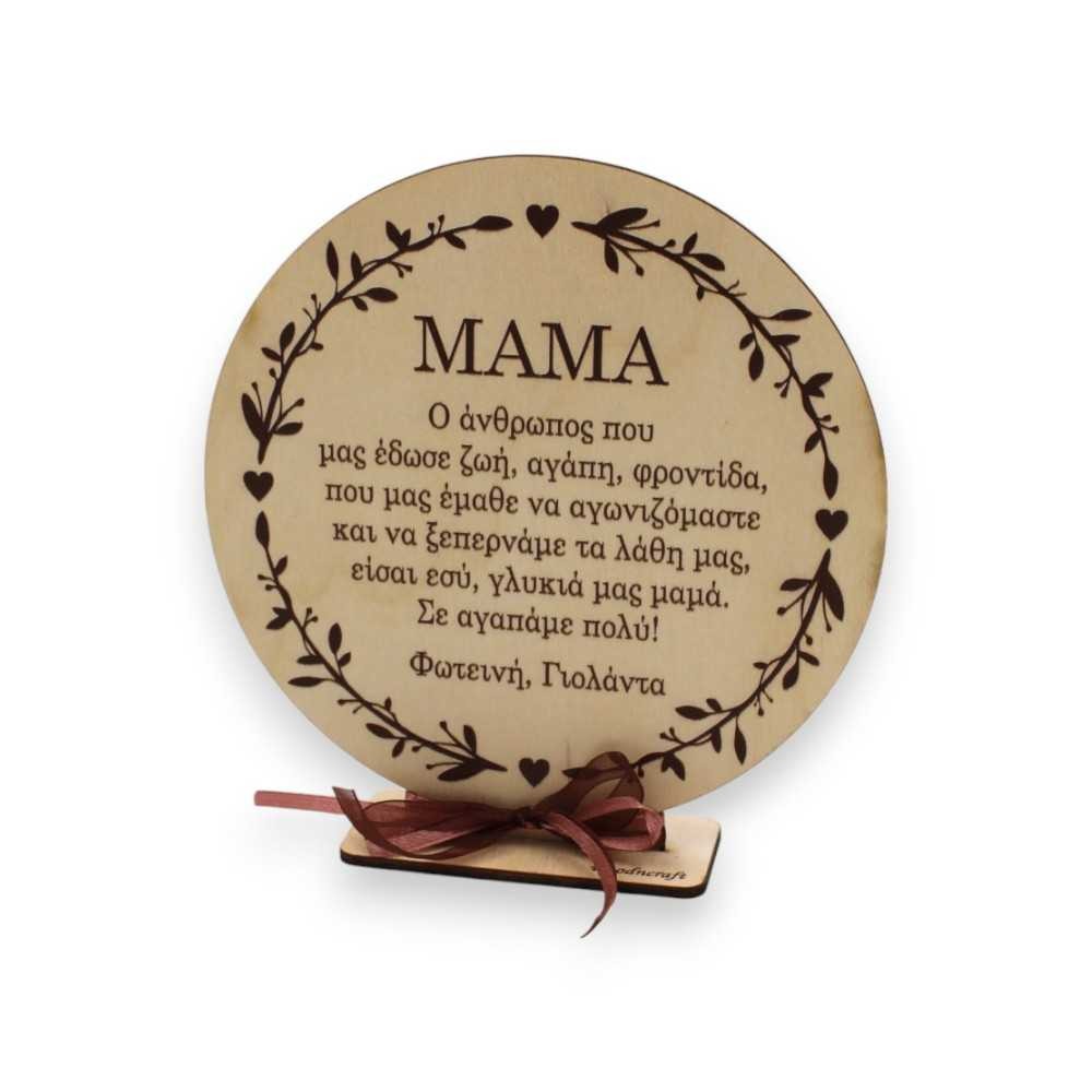 Αυτό το κομψό επιτραπέζιο διακοσμητικό από φυσικό ξύλο, με διάμετρο 15 εκ., είναι αφιερωμένο στη γυναίκα που μας χάρισε ζωή, αγάπη και φροντίδα — τη μαμά.