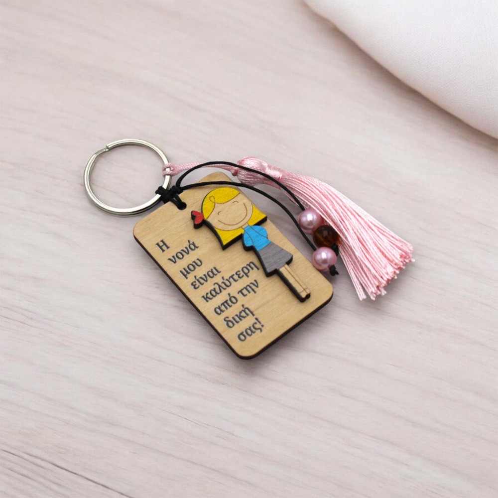 Πρωτότυπο ξύλινο χειροποίητο μπρελόκ με φιγούρα και χάραξη: Η νονά μου είναι καλύτερη από την δική σας!