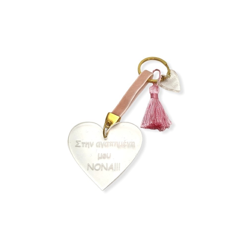 Μοναδικό χειροποίητο μπρελόκ υψηλής αισθητικής φτιαγμένο με βελούδινο λουράκι και 2 διάφανες πλεξιγκλάς καρδούλες, η μεγάλη χαραγμένη με αφιέρωση "Στην αγαπημένη μου νονά" και η μικρή "με αγάπη" και το όνομα της επιλογής σας! Φτιαγμένο με κρίκο και μεταλλικά κουμπώματα σε χρυσή απόχρωση και διακοσμημένο με ροζ φουντίτσα!