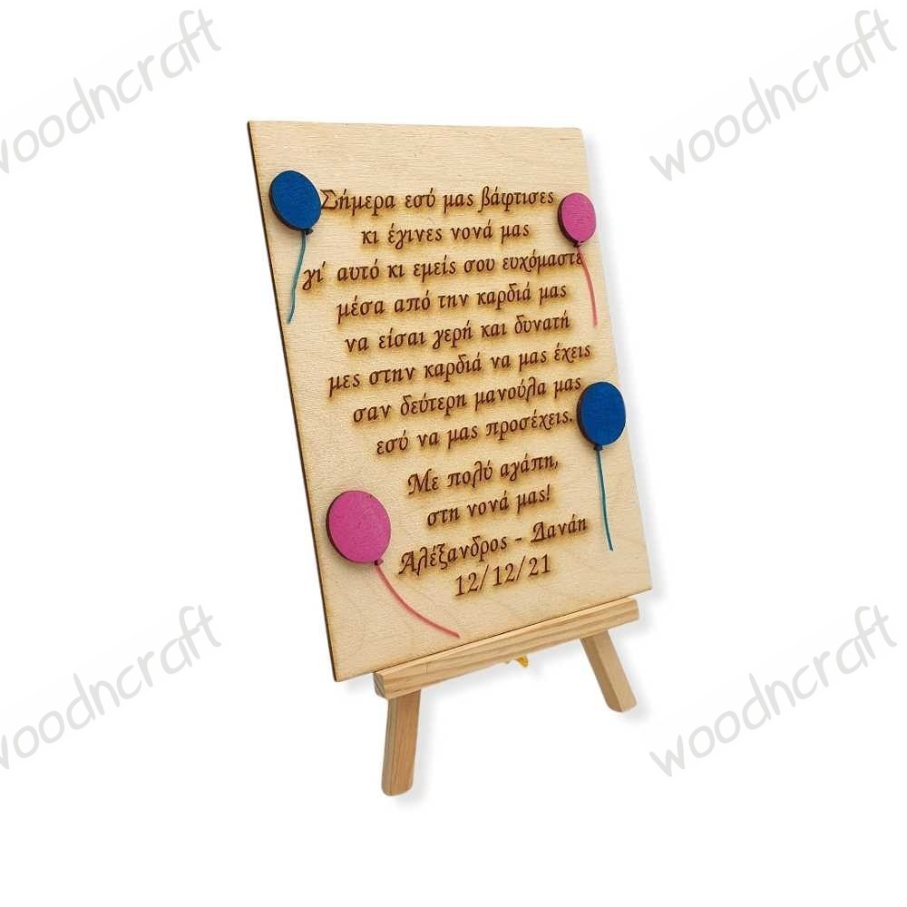 Ξύλινο χειροποίητο καδράκι βάφτισης, διακοσμημένο με μπαλόνια... στηριζόμενο σε καβαλέτο και χαραγμένο με το κειμενάκι της επιλογής σας.