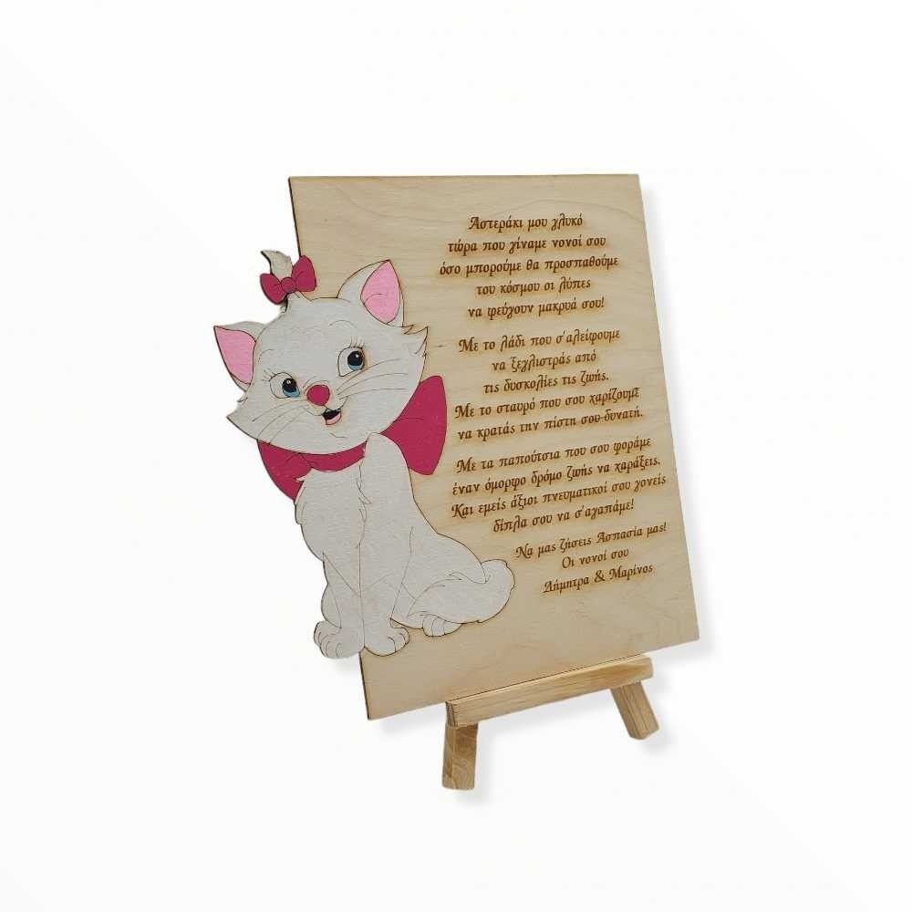 Ξύλινο χειροποίητο καδράκι βάφτισης με προσαρμοσμένη την αγαπημένη Μαρί από το παιδικό Αριστόγατες... στηριζόμενο σε καβαλέτο και χαραγμένο με το κειμενάκι της επιλογής σας.