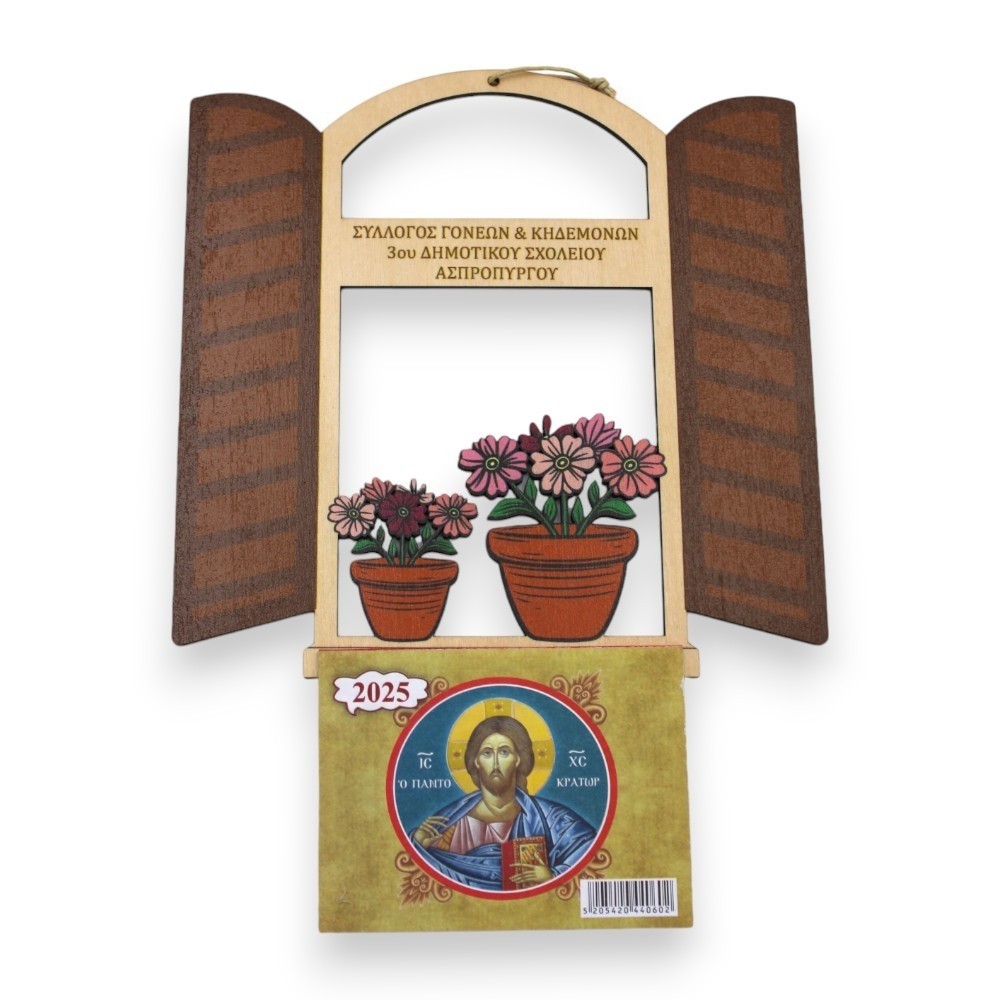 Πρωτότυπο ξύλινο χειροποίητο ημερολόγιο σε σχέδιο παράθυρο στολισμένο με δύο όμορφα γλαστράκια με λουλούδια! Ιδανικά για σχολεία και συλλόγους που θέλουν να ξεχωρίζουν!
