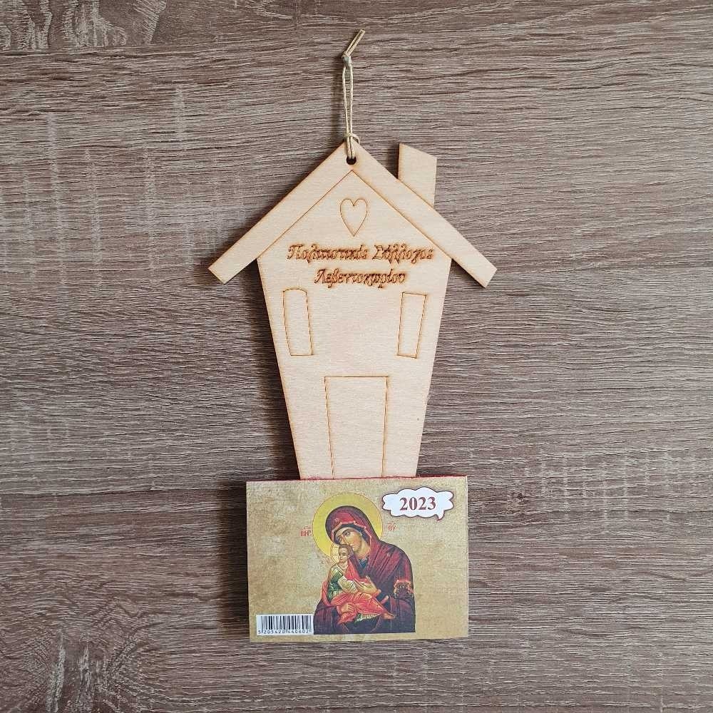 Πρωτότυπο ξύλινο ημερολόγιο σε σχέδιο μακρόστενο σπιτάκι με καρδιά και χάραξη με τον σύλλογο, το σχολείο ή μια αφιέρωση της επιλογής σας!