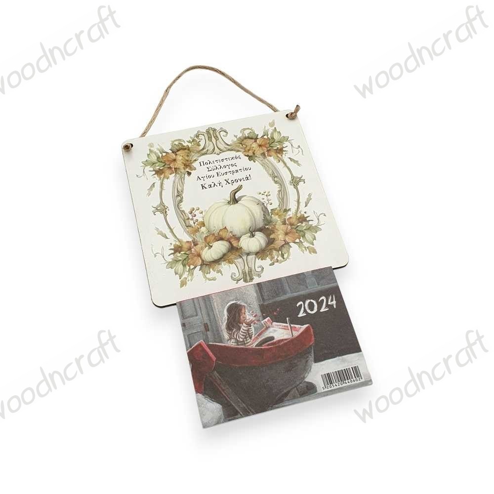 Προσθέστε μια πινελιά φύσης στο χώρο σας με αυτό το κομψό ξύλινο ημερολόγιο καδράκι που απεικονίζει λευκές κολοκύθες, σε ένα ρομαντικό σκηνικό με φύλλα και κλαδιά. Μέσα στο σχέδιο υπάρχει χώρος για εκτύπωση του ονόματος του σχολείου, του συλλόγου ή της επιχείρησής σας με την ακρίβεια της εκτύπωσης UV.