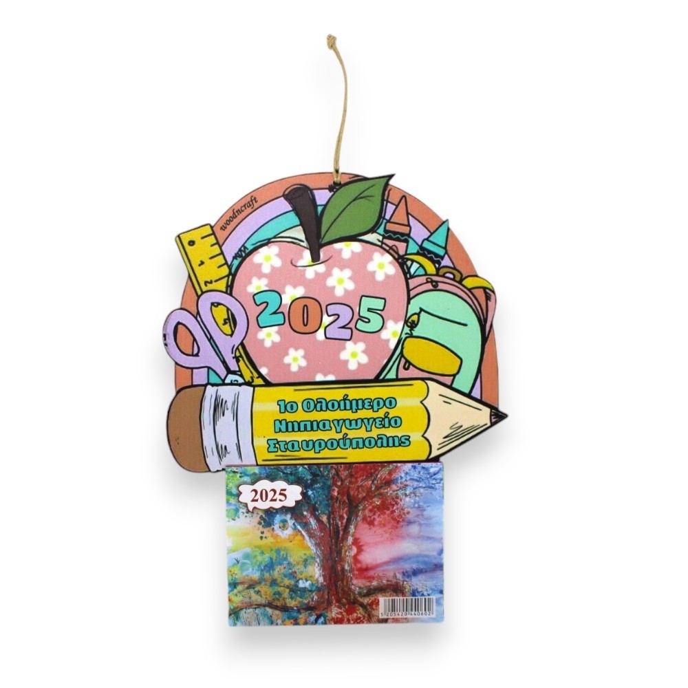Το Ξύλινο Ημερολόγιο - Σχολικά Αξεσουάρ με Ουράνιο Τόξο είναι ένα χαρούμενο και διασκεδαστικό διακοσμητικό για την ενίσχυση της σχολικής διάθεσης. Με έναν πολύχρωμο σχεδιασμό που περιλαμβάνει τσάντα, μολύβι, ψαλίδι, χάρακα, μήλο και κηρομπογιές, αυτό το χειροποίητο κρεμαστό ημερολόγιο αποπνέει παιδικότητα και ζωντάνια. Στο μήλο εμφανίζεται τυπωμένη η νέα χρονιά, ενώ στο μολύβι μπορείτε να προσθέσετε το όνομα του συλλόγου, σχολείου ή επιχείρησής σας, δίνοντας μια εξατομικευμένη πινελιά.