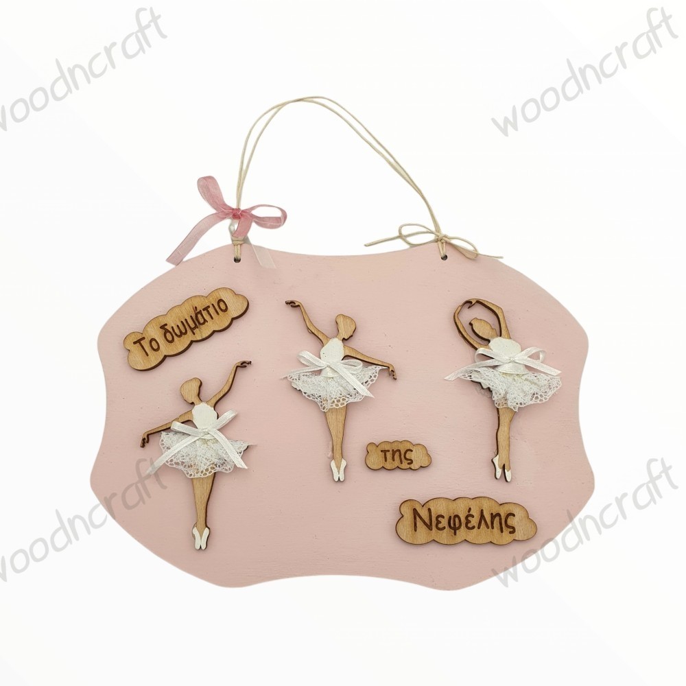Ξύλινο χειροποίητο παιδικό ταμπελάκι δωματίου με μπαλαρίνες και φυσικά το όνομα της επιλογής σας. Βαμμένο στα χρώματα της επιλογής σας και διακοσμημένο με κορδελάκι, χάντρες και δαντελωτά φουστανάκια για τις μπαλαρίνες!