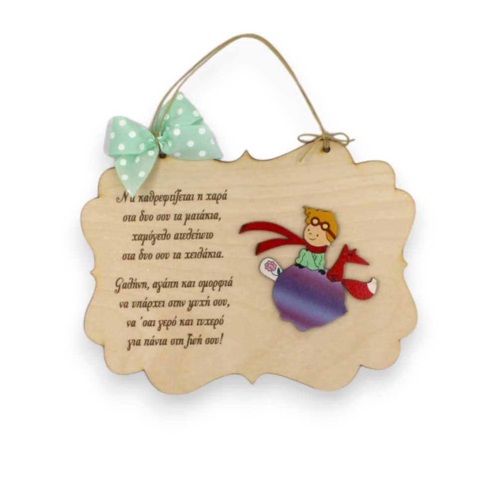 Ξύλινο χειροποίητο παιδικό αναμνηστικό καδράκι με χαραγμένη αφιέρωση για το πιο γλυκό μωράκι. Ένα πρωτότυπο παιδικό δωράκι διακοσμημένο με τον μικρό πρίγκιπα πάνω στον αγαπημένο του πλανήτη, παρέα με την αλεπού και το μοναδικό του τριαντάφυλλο ιδανικό για να διακοσμήσει το πιο όμορφο παιδικό δωμάτιο!