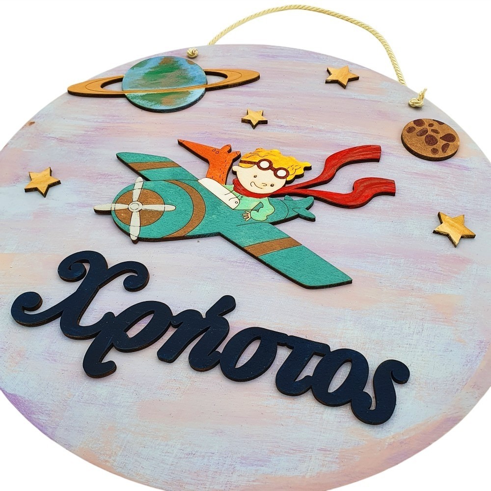 Ξύλινο χειροποίητο διακοσμητικό κάδρο με αναπαράσταση τον μικρό πρίγκιπα σε αεροπλάνο μαζί με την αγαπημένη του αλεπού, πλανήτες, αστέρια και το όνομα της επιλογής σας! Ένα μοναδικό καδράκι έτοιμο να διακοσμήσει το πιο όμορφο παιδικό δωμάτιο και να κλέψει τις εντυπώσεις!