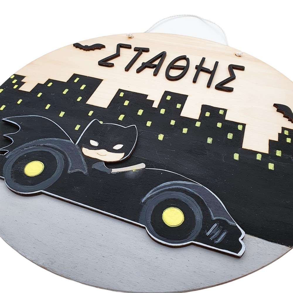 Ξύλινο χειροποίητο διακοσμητικό κάδρο με φόντο την Gotham City , τον αγαπημένο Batman μέσα στο batmobile και το όνομα της επιλογής σας! Ένα μοναδικό καδράκι έτοιμο να διακοσμήσει το πιο όμορφο παιδικό δωμάτιο και να κλέψει τις εντυπώσεις!