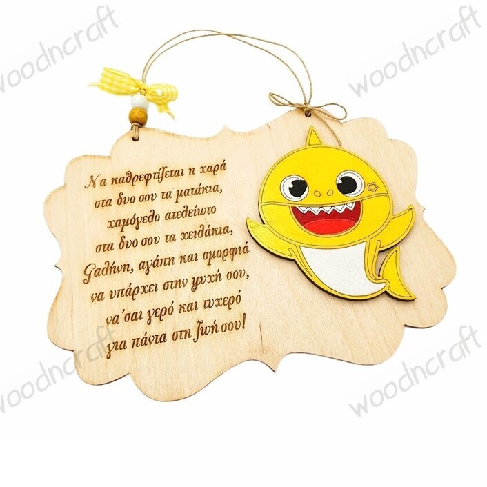 Ξύλινο χειροποίητο παιδικό αναμνηστικό καδράκι με χαραγμένη αφιέρωση για το πιο γλυκό μωράκι. Ένα πρωτότυπο παιδικό δωράκι διακοσμημένο με ένα χαριτωμένο καρχαριάκι από την παιδική σειρά Baby Shark ιδανικό για να διακοσμήσει το πιο όμορφο παιδικό δωμάτιο!