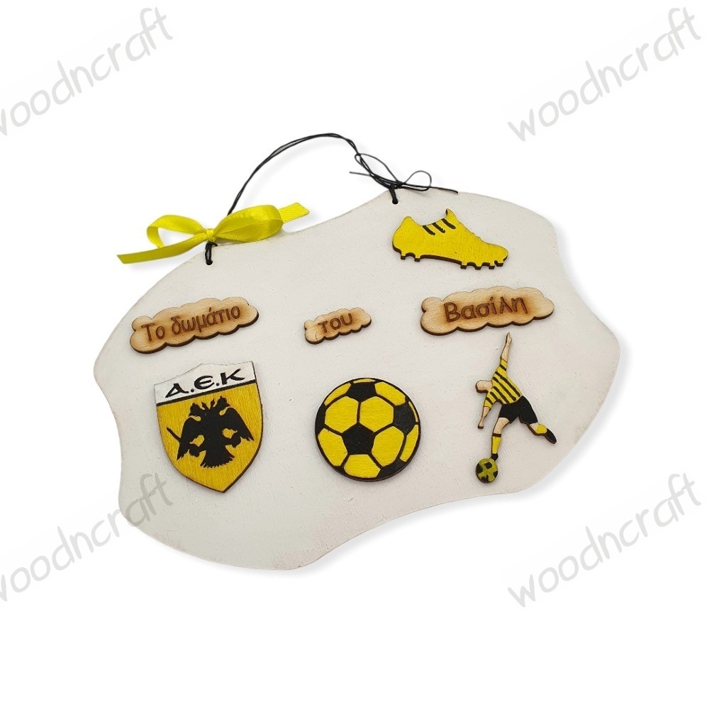 Μοναδικό ξύλινο χειροποίητο παιδικό ταμπελάκι δωματίου με θέμα την ομάδα της ΑΕΚ και φυσικά το όνομα του παιδιού! Ταιριάζει όμορφα στην πόρτα του παιδικού δωματίου ενός μικρού φανατικού οπαδού!