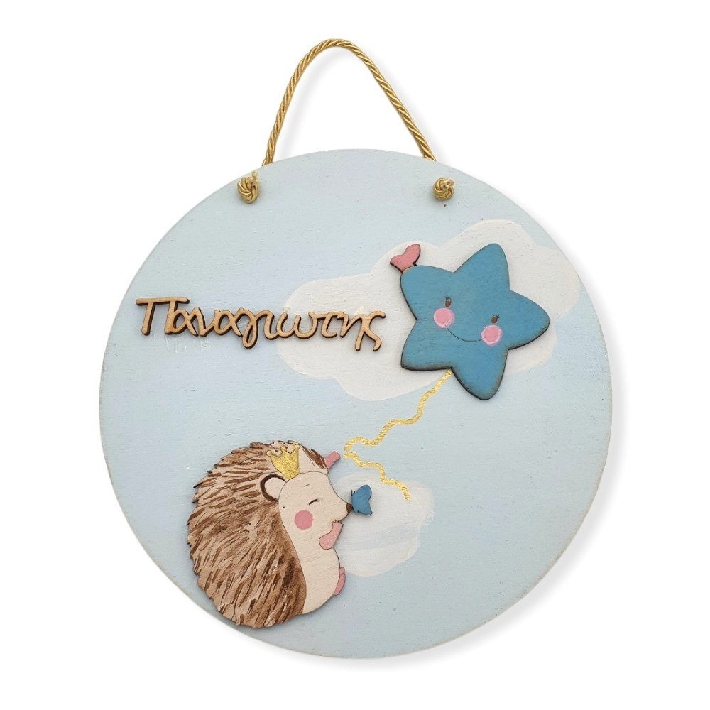Ξύλινο χειροποίητο διακοσμητικό κάδρο με ένα μικρό, γλυκό σκαντζοχοιράκι με κορώνα που κρατάει ένα μπαλόνι αστεράκι και φυσικά το όνομα της επιλογής σας! Ένα μοναδικό καδράκι έτοιμο να διακοσμήσει το πιο όμορφο παιδικό δωμάτιο και να κλέψει τις εντυπώσεις!