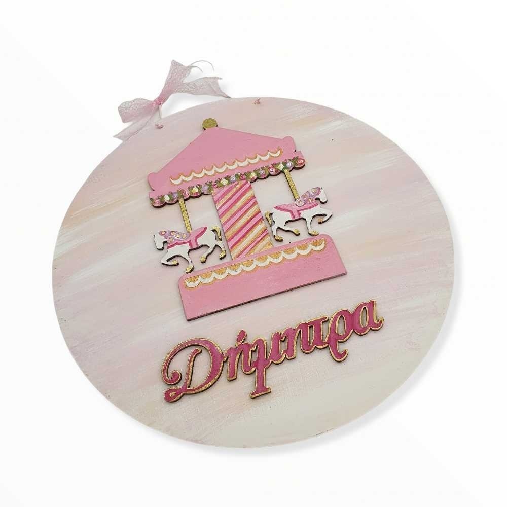 Ξύλινο χειροποίητο διακοσμητικό κάδρο με καρουζέλ και φυσικά το όνομα της επιλογής σας. Ένα μοναδικό διακοσμητικό σε ξύλινη στρογγυλή βάση , έτοιμο να διακοσμήσει το πιο ονειρεμένο παιδικό δωμάτιο και να κλέψει τις εντυπώσεις!