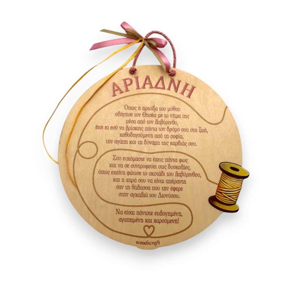 Γιορτάστε την έλευση ενός νέου μωρού με αυτό το χειροποίητο ξύλινο καδράκι φυλαχτό "Ο Μίτος της Αριάδνης". Κατασκευασμένο σε στρογγυλό σχήμα με διάμετρο 20cm, το καδράκι διαθέτει τυπωμένο κειμενάκι με ευχές, προσφέροντας ένα μοναδικό και προσωπικό δώρο.