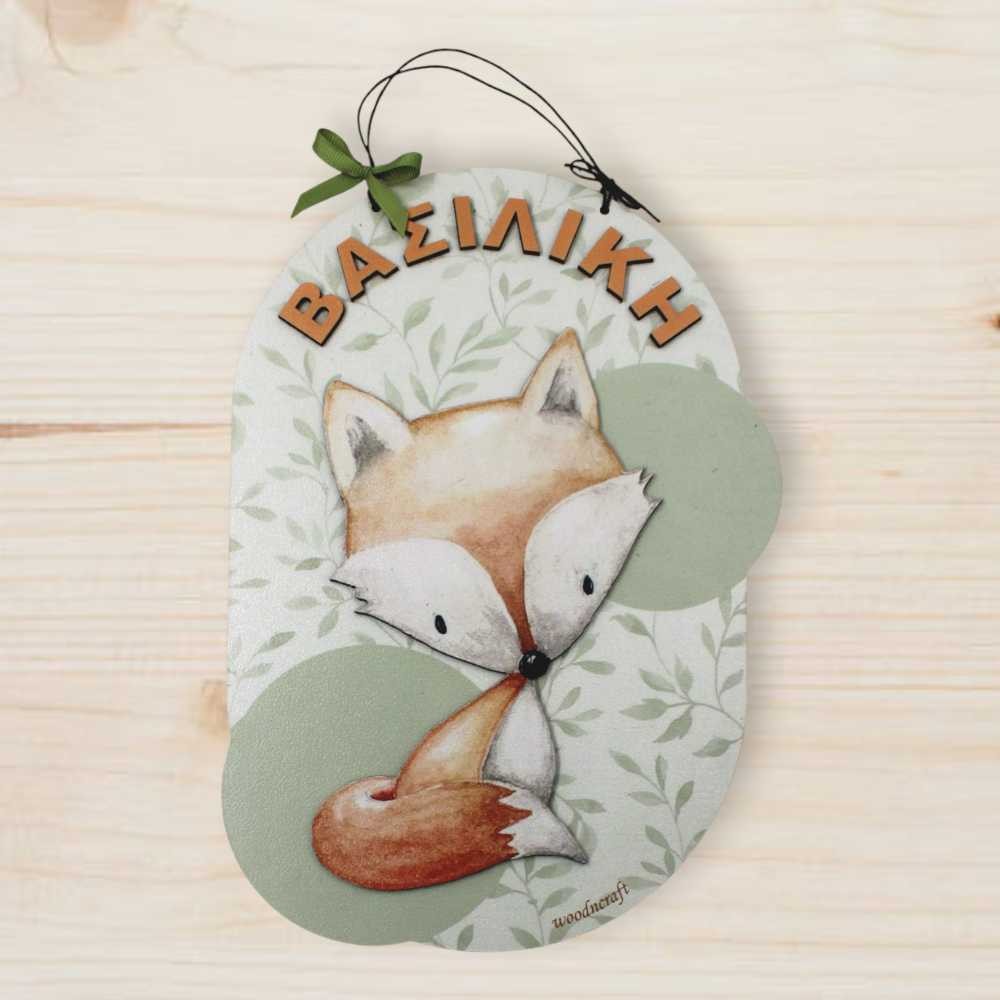 Η βάση είναι από ξύλο με εκτύπωση υψηλής ποιότητας, ενώ η αλεπού και το όνομα του παιδιού είναι κομμένα από επιπλέον στρώση ξύλου, δημιουργώντας μια τρισδιάστατη, ανάγλυφη όψη.