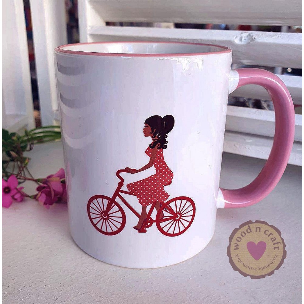 Πρωτότυπη ρομαντική κούπα από λευκή πορσελάνη με ροζ αποχρώσεις. Από την μία πλευρά απεικονίζεται μία κοπέλα σε ένα ποδήλατο και από την άλλη πλευρά υπάρχει το κειμενάκι: Life is like a bicycle. To keep your balance you have to keep moving! Μπορεί να τυπωθεί κειμενάκι ή αφιέρωση της επιλογής σας.