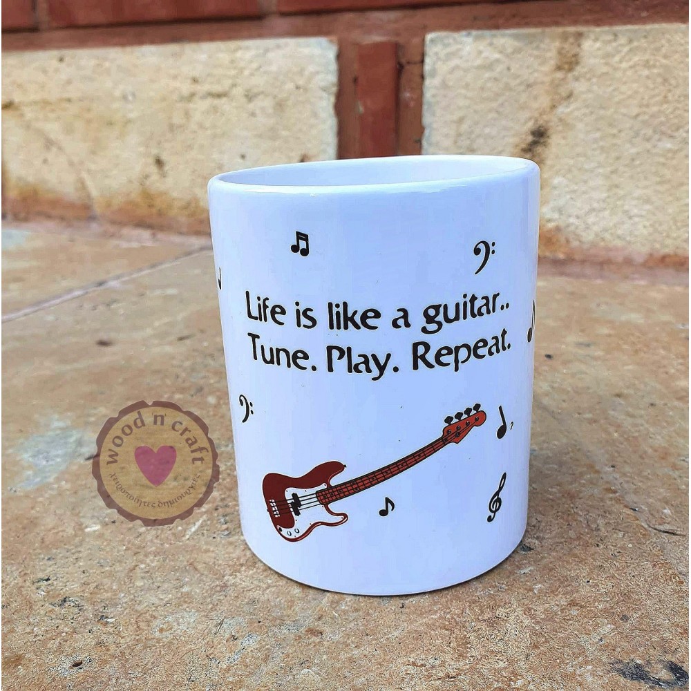 Πρωτότυπη κούπα από λευκή πορσελάνη για να χαρίσετε στον εαυτό σας ή σε κάποιον που αγαπάτε! Ένα ξεχωριστό σχέδιο με 4 κιθάρες, σκόρπιες νότες και το στιχάκι: Life is like a guitar.. Tune. Play. Repeat.