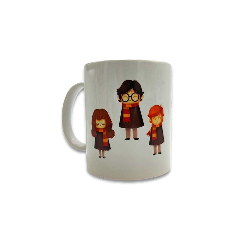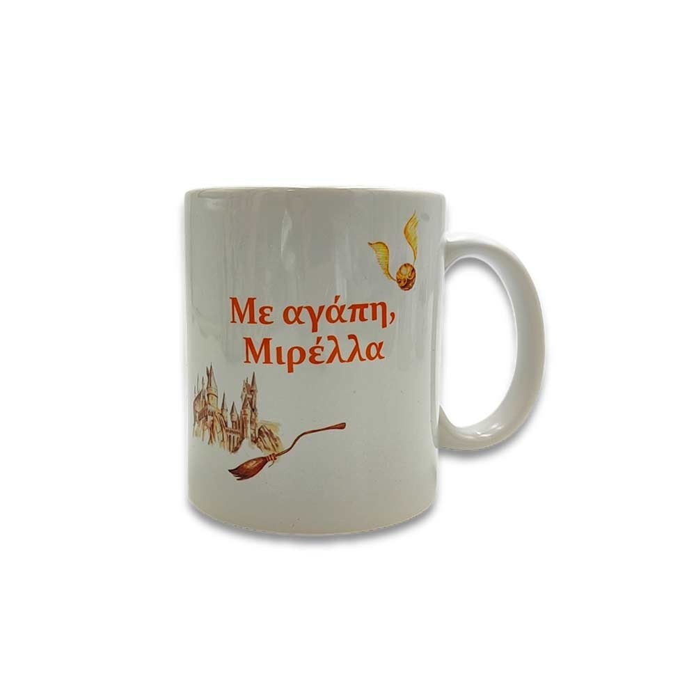 Πρωτότυπη κούπα από λευκή πορσελάνη με τυπωμένες φιγούρες του Χάρυ, του Ρον και της Ερμιόνης και από την άλλη πλευρά την αφιέρωση της επιλογής σας με φόντο το κάστρο του Χόγκουαρτς!