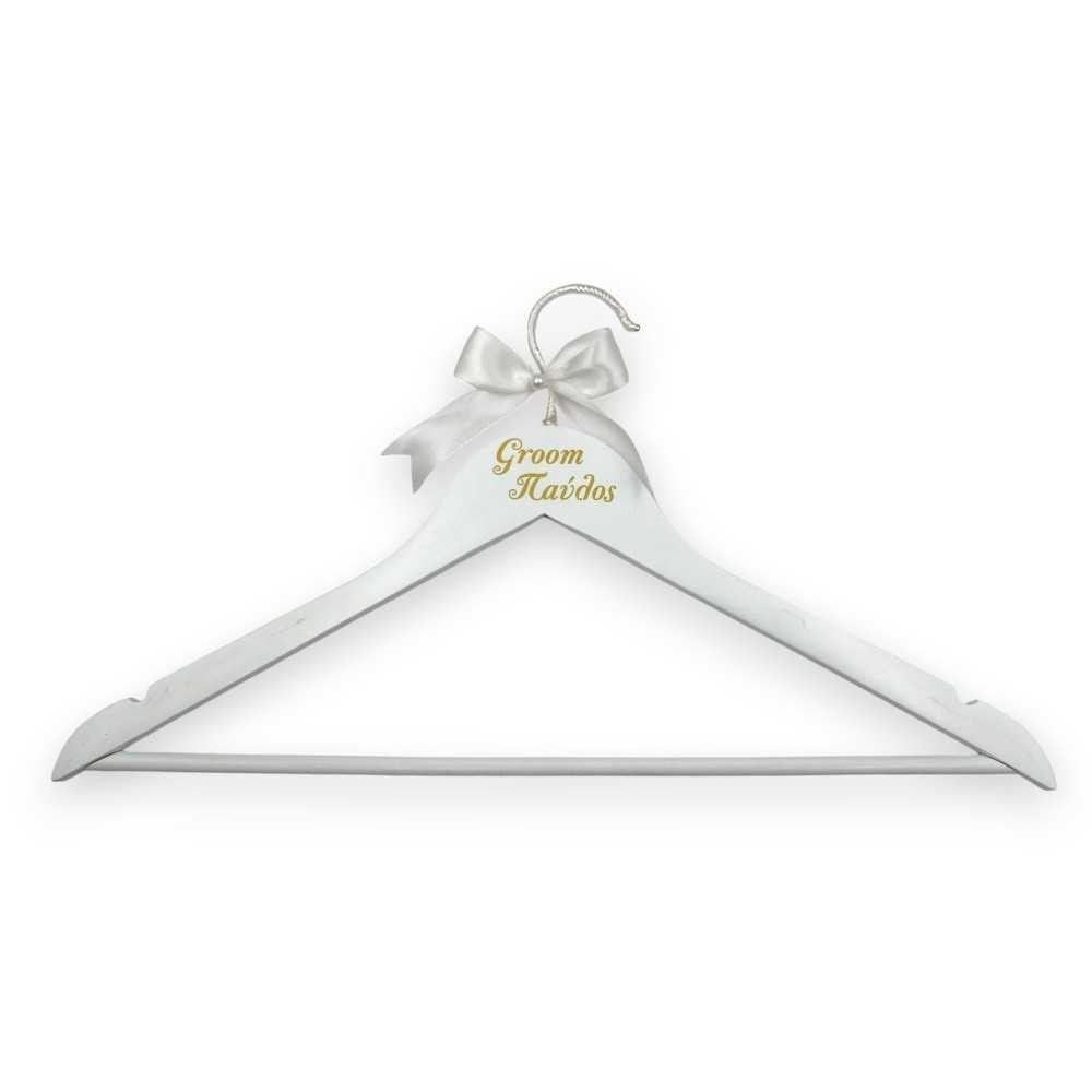Μια ιδιαίτερη ξύλινη κρεμάστρα σε λευκό χρώμα, σχεδιασμένη αποκλειστικά για τη σημαντικότερη μέρα του γαμπρού.