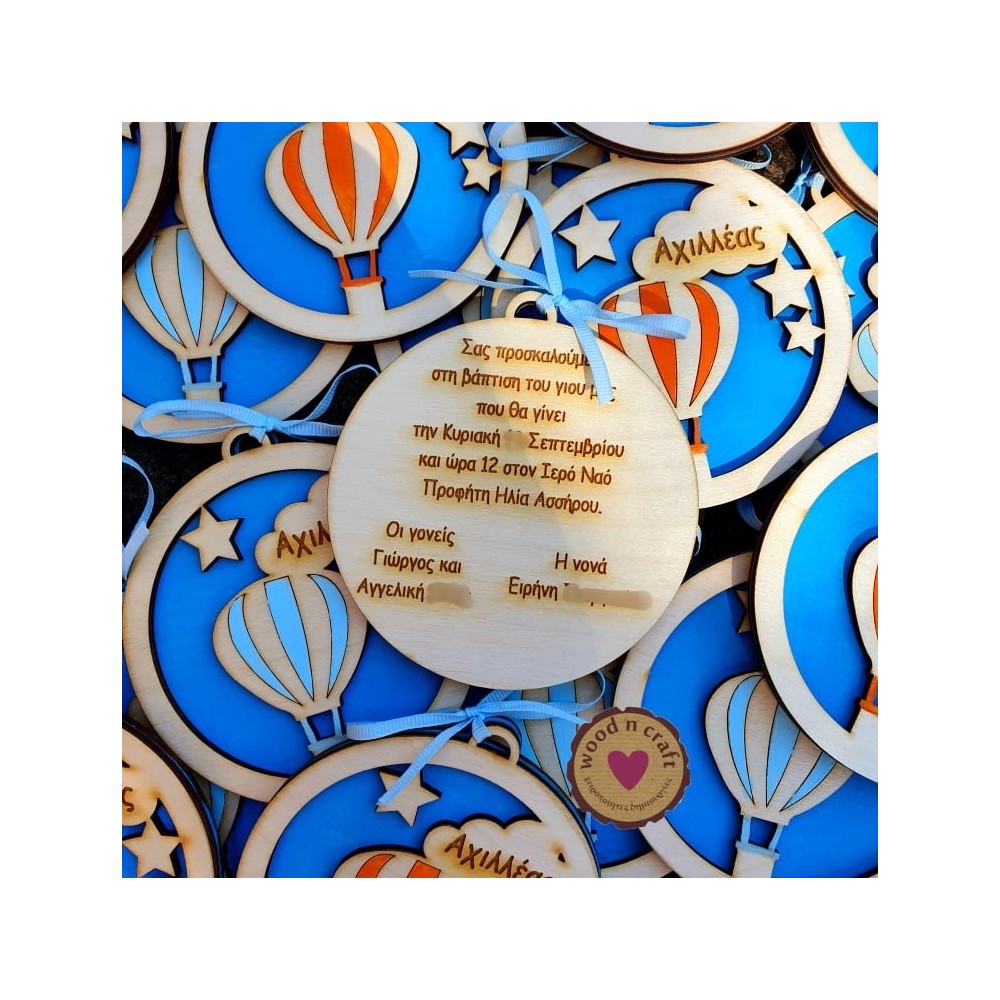 Μοναδικό ξύλινο προσκλητήριο βάπτισης με θέμα το αερόστατο. Στην μπροστά μεριά υπάρχει προσαρμοσμένο ένα αερόστατο, αστεράκια και ένα συννεφάκι με χαραγμένο το όνομα που θα δοθεί στο παιδί ενώ στην πίσω μεριά υπάρχει χαραγμένο το κειμενάκι πρόσκλησης μαζί με τα στοιχεία της βάπτισης σας.