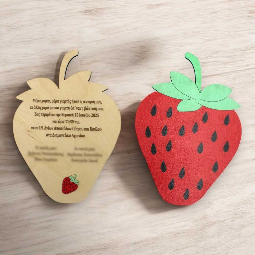 Μοναδικό ξύλινο προσκλητήριο βάπτισης σε σχέδιο φράουλα, από την μία πλευρά υπάρχει χαραγμένο το κειμενάκι πρόσκλησης μαζί με τα στοιχεία της βάπτισης σας και από την άλλη μία κατακόκκινη ζουμερή φραουλίτσα!