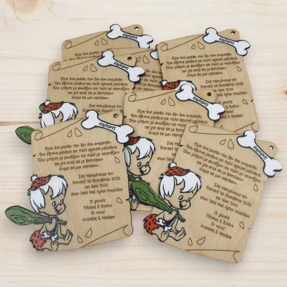 Μοναδικό ξύλινο προσκλητήριο βάπτισης σε σχέδιο πάπυρος, με προσαρμοσμένο τον αγαπημένο Μπαμ Μπαμ από την παιδική σειρά Flinstones, ένα κόκκαλο και χαραγμένο το κειμενάκι πρόσκλησης μαζί με τα στοιχεία της βάπτισης σας.