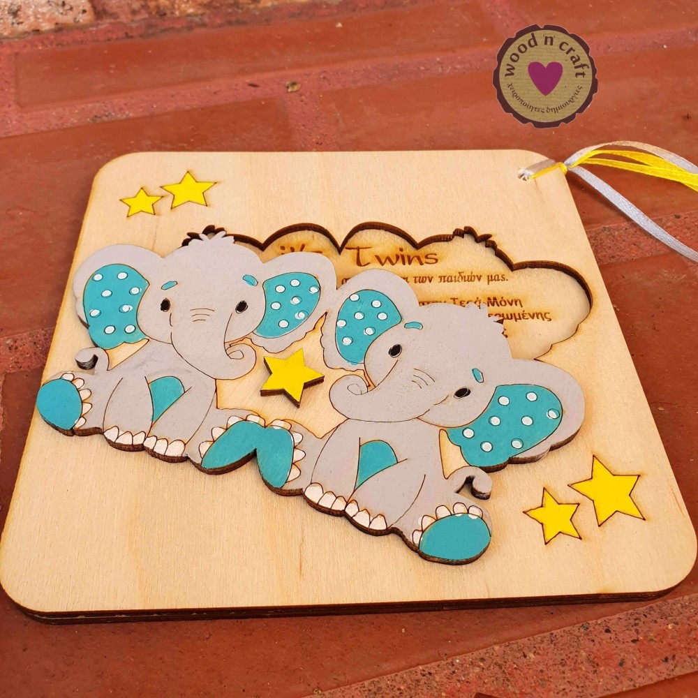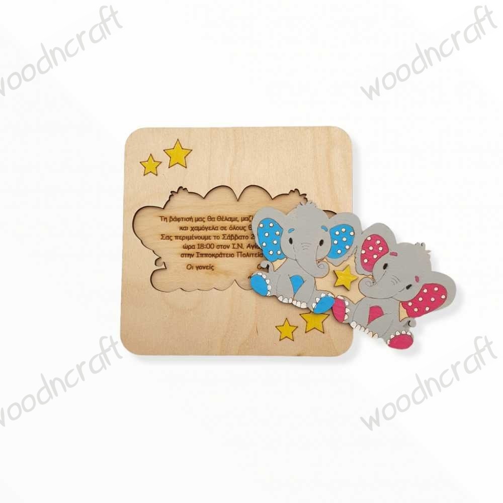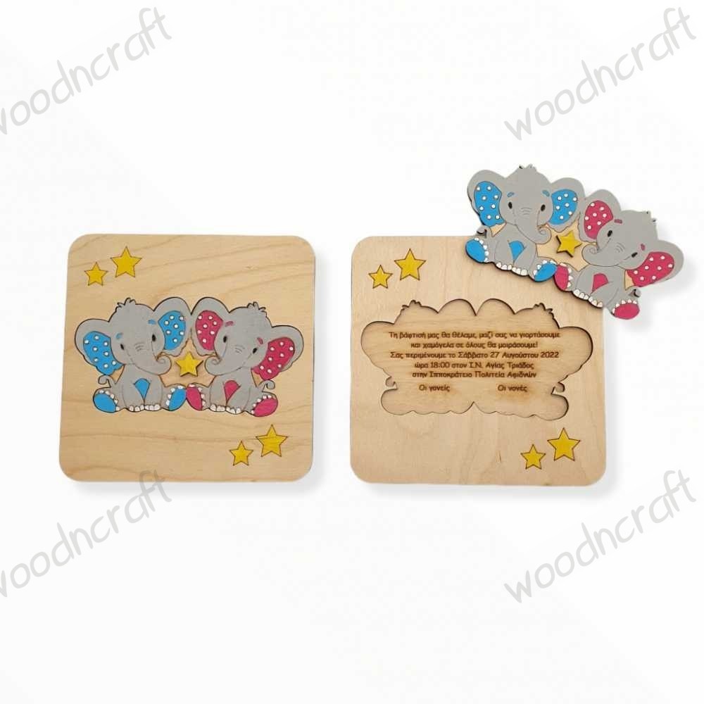 Πρωτότυπο και μοναδικό ξύλινο προσκλητήριο βάπτισης παζλ σε σχέδιο δίδυμα ελεφαντάκια. Αφαιρούμε τα ελεφαντάκια και ανακαλύπτουμε χαραγμένο το κειμενάκι πρόσκλησης μαζί με τα στοιχεία της βάπτισης, βάζουμε τα ελεφαντάκια στην θέση του και δημιουργούμε ένα όμορφο παιδικό διακοσμητικό!
