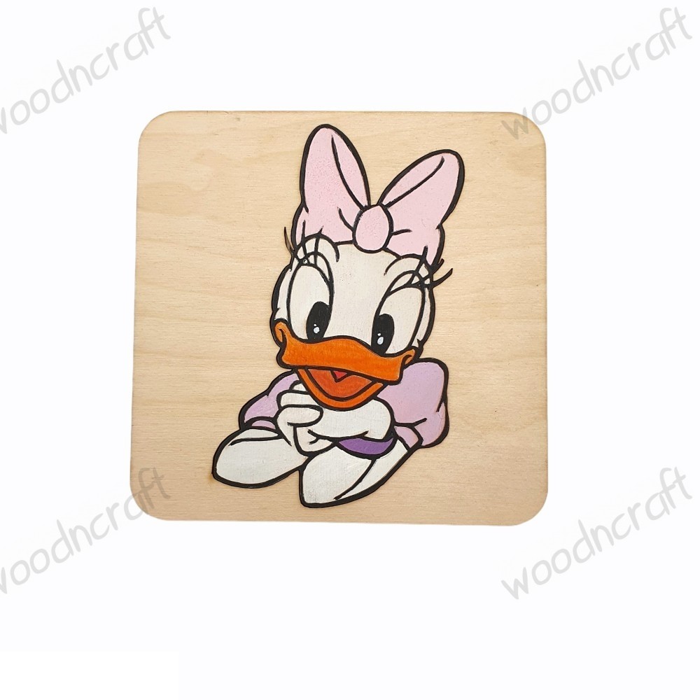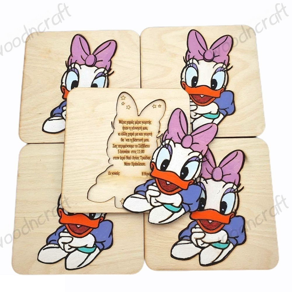 Πρωτότυπο ξύλινο προσκλητήριο βάπτισης παζλ σε σχέδιο Νταίζη Ντακ. Αφαιρούμε την αγαπημένη Νταίζη και ανακαλύπτουμε χαραγμένο το κειμενάκι πρόσκλησης μαζί με τα στοιχεία της βάπτισης, βάζουμε την Νταίζη στην θέση της και δημιουργούμε ένα όμορφο παιδικό διακοσμητικό!