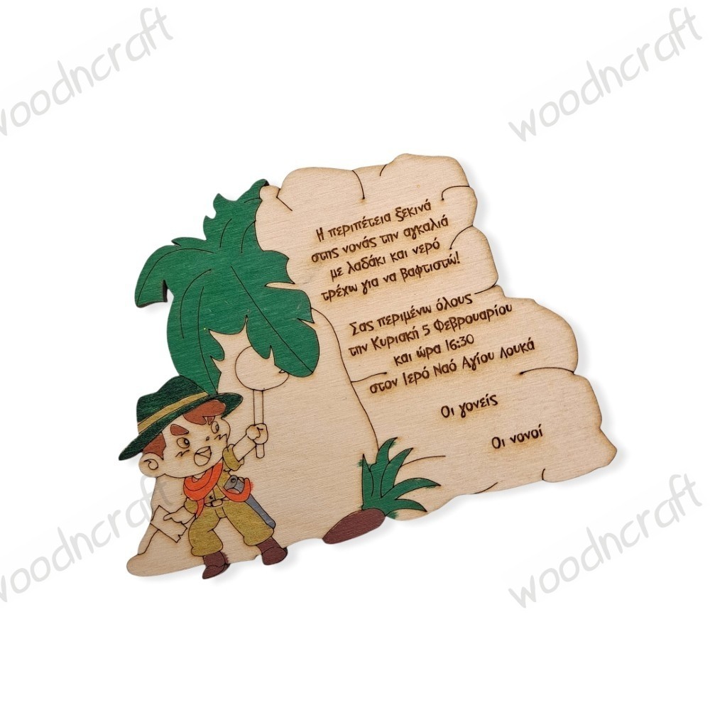 Μοναδικό ξύλινο προσκλητήριο βάπτισης σε σχήμα σπηλιάς με τον μικρό εξερευνητή που είναι έτοιμος να ανακαλύψει τι κρύβεται μέσα. Επάνω είναι χαραγμένο το κειμενάκι πρόσκλησης μαζί με τα στοιχεία της βάπτισης σας.
