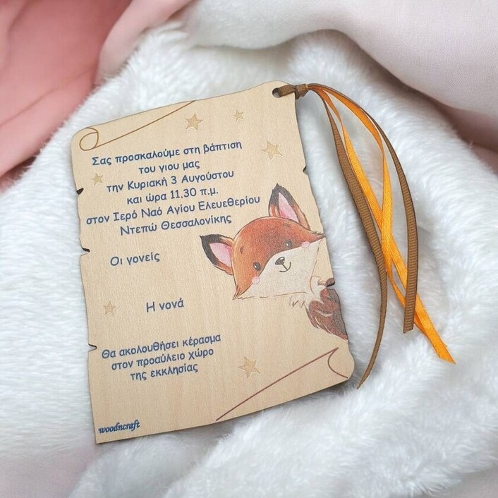 Με μέγεθος 15 cm, το προσκλητήριο είναι κατασκευασμένο από υψηλής ποιότητας ξύλο και διαθέτει εκτύπωση UV, εξασφαλίζοντας ανθεκτικότητα και ζωντανά χρώματα. Το κειμενάκι της πρόσκλησης, μαζί με τα στοιχεία της εκδήλωσης, είναι προσεκτικά τοποθετημένο δίπλα στο χαριτωμένο αλεπουδάκι, δημιουργώντας μια ζεστή και φιλική ατμόσφαιρα.