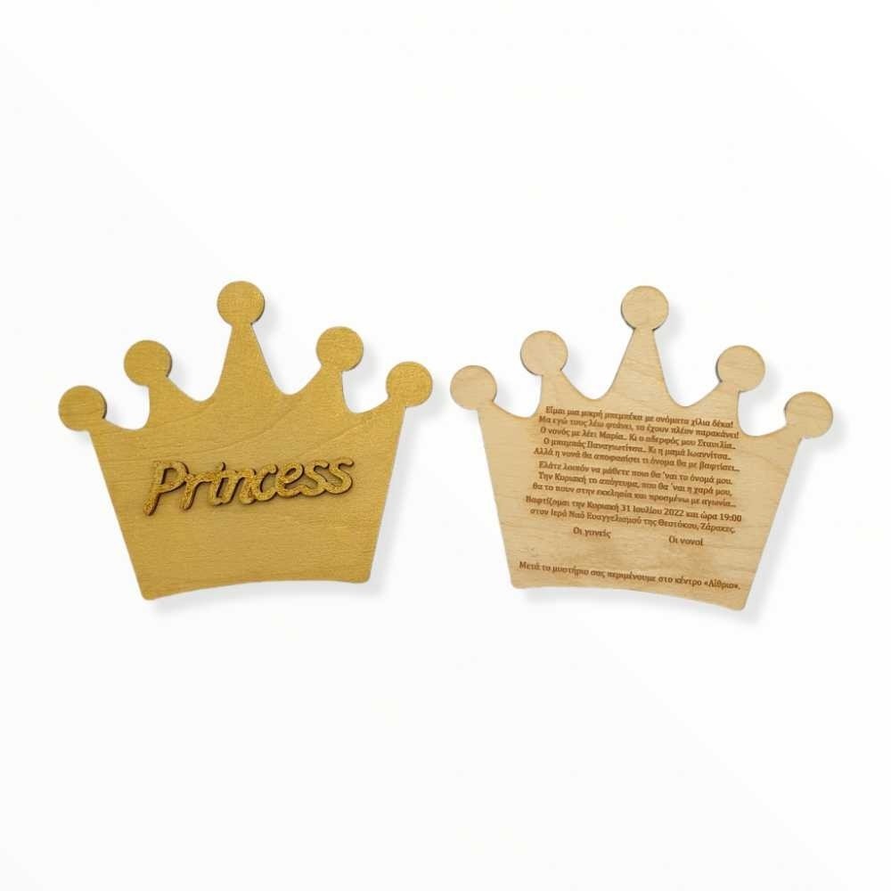 Μοναδικό ξύλινο προσκλητήριο βάπτισης σε σχέδιο κορώνα "princess" με χαραγμένο το κειμενάκι πρόσκλησης μαζί με τα στοιχεία της βάπτισης σας.