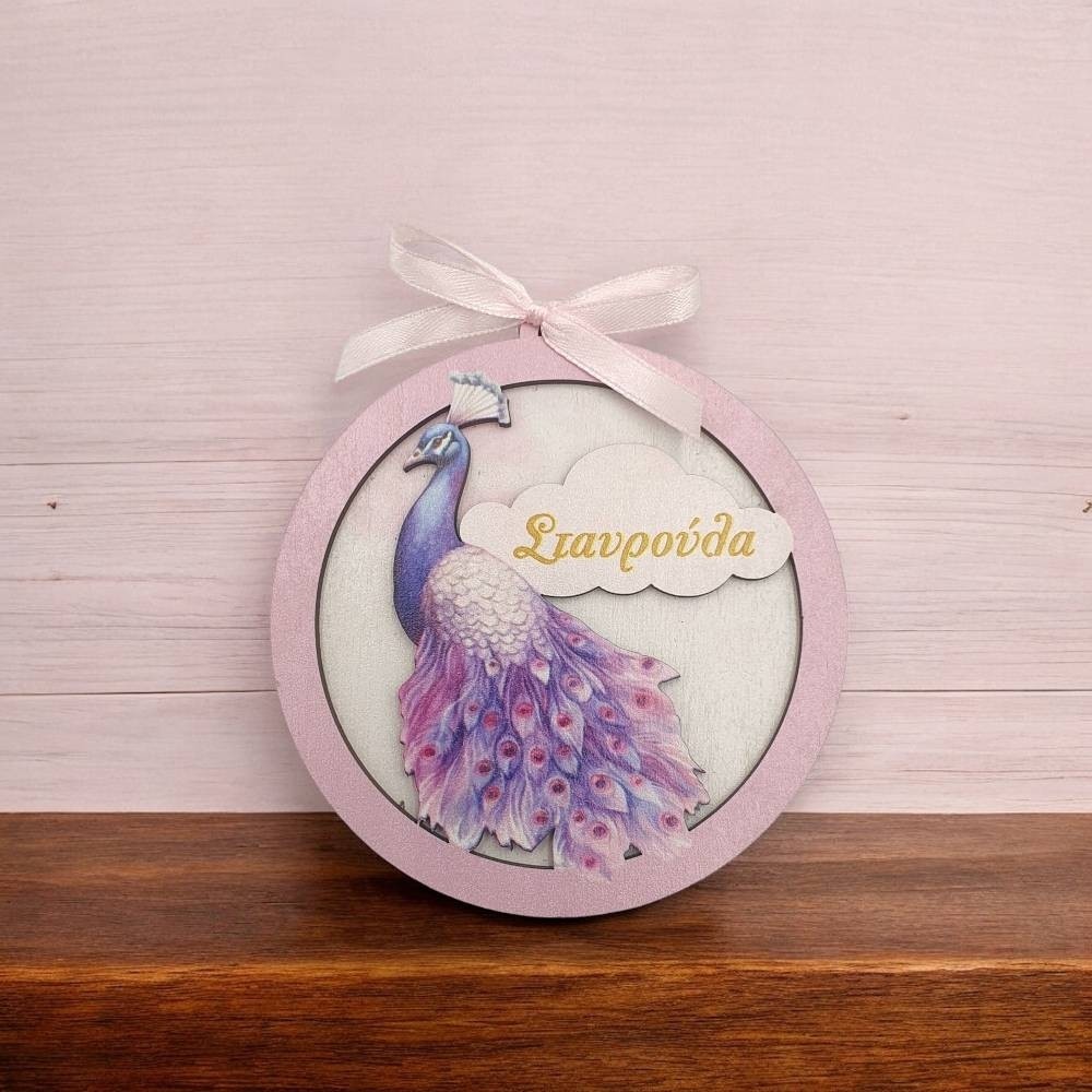 Δημιουργήστε μαγευτικές αναμνήσεις με το εντυπωσιακό ξύλινο προσκλητήριο σε στρόγγυλο σχήμα, με θέμα το παγώνι. Ιδανικό για βάπτιση ή γενέθλια, αυτό το προσκλητήριο ξεχωρίζει για την ομορφιά και τη φινέτσα του. Στην μπροστινή όψη, ένα εντυπωσιακό παγώνι και ένα τυπωμένο συννεφάκι με το όνομα του παιδιού προσθέτουν μια παιχνιδιάρικη και κομψή πινελιά.