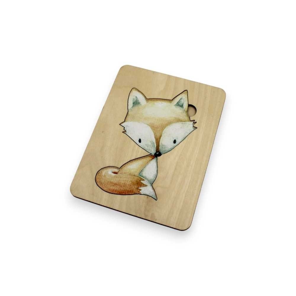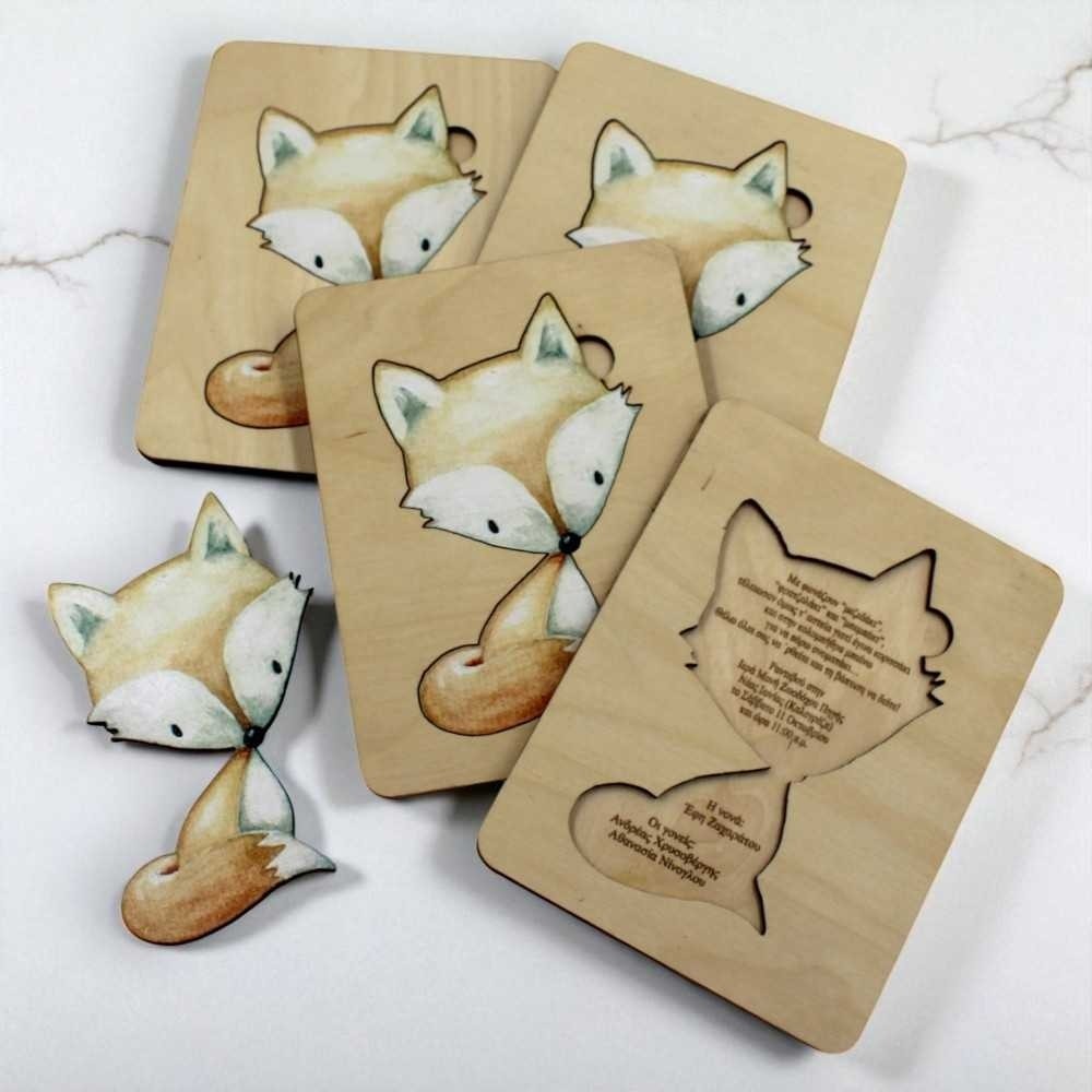 Πρωτότυπο και μοναδικό ξύλινο προσκλητήριο βάπτισης παζλ σε σχέδιο αλεπού.
