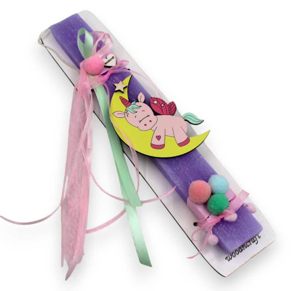 Χειροποίητη πασχαλινή λαμπάδα με ξύλινη φιγούρα μωράκι μονόκερο πάνω στο φεγγάρι βαμμένη στο χέρι!