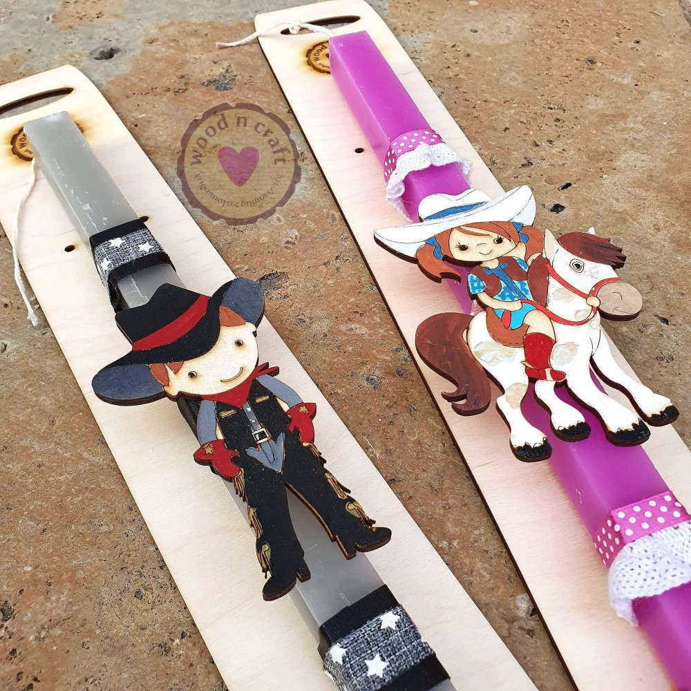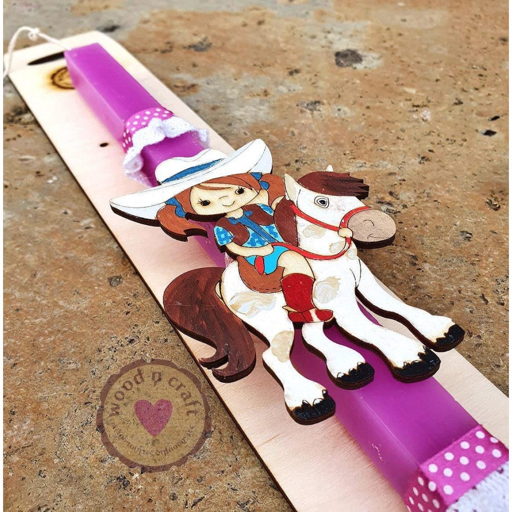 Πρωτότυπη χειροποίητη πασχαλινή λαμπάδα για κοριτσάκι διακοσμημένη με ξύλινη παιδική φιγούρα καουμπόισα πάνω σε άλογο!