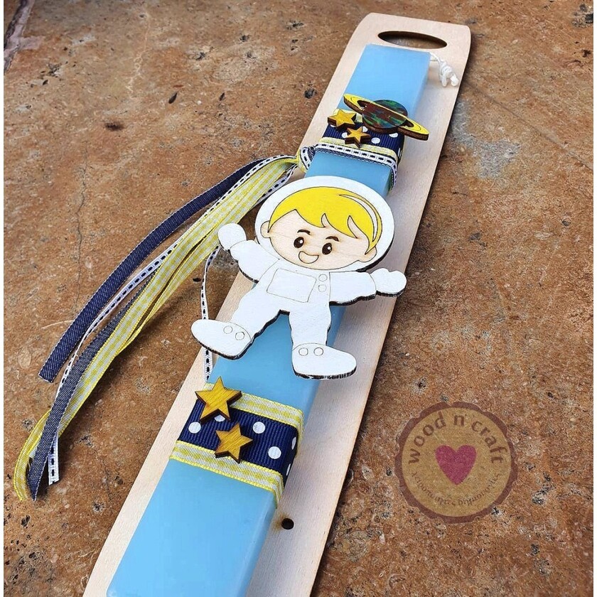 Πρωτότυπη και ξεχωριστή χειροποίητη πασχαλινή λαμπάδα με ξύλινο αστροναύτη σε σετ με καδράκι για το παιδικό δωμάτιο με το όνομα του παιδιού και θέμα το διάστημα!