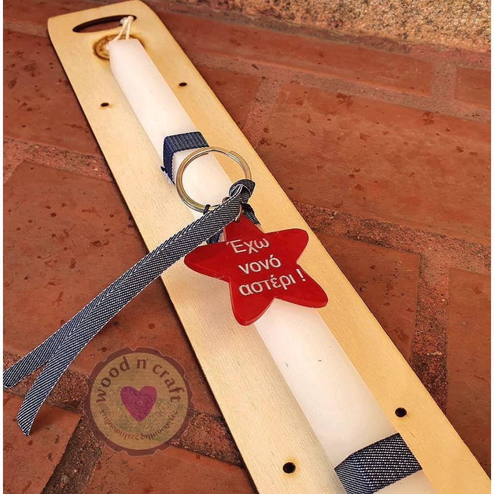 Πρωτότυπη χειροποίητη πασχαλινή λαμπάδα για να χαρίσετε εσείς στο νονό σας διακοσμημένη με κορδελάκια και ένα μπρελόκ από κόκκινο πλεξιγκλάς με χάραξη Έχω νονό αστέρι!