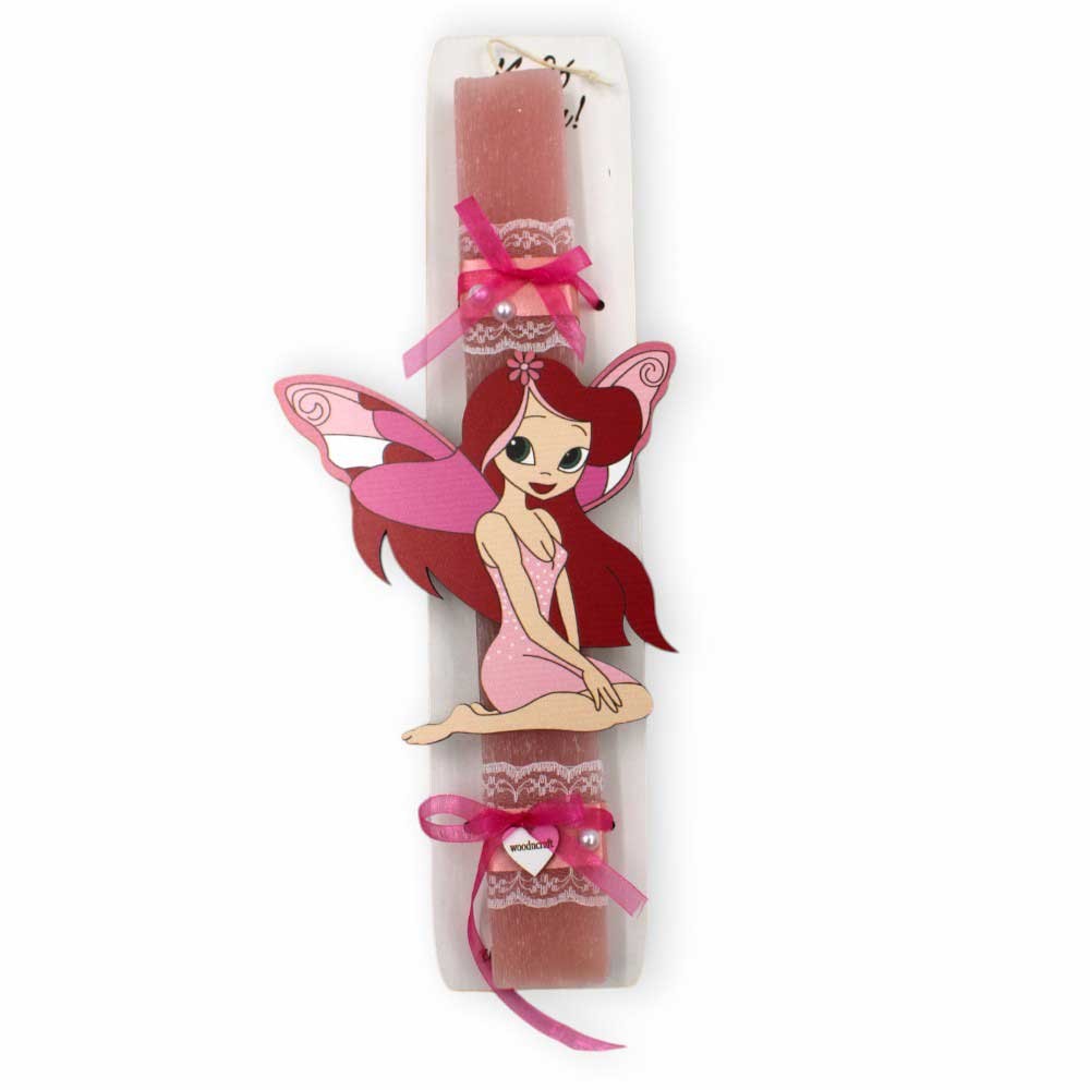 Πρωτότυπη χειροποίητη πασχαλινή λαμπάδα διακοσμημένη με κορδελάκια και μία γλυκιά νεράιδα βαμμένη σε αποχρώσεις στα ροζ!