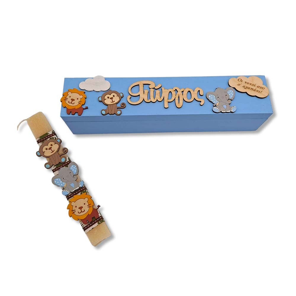 Χειροποίητη αρωματική λαμπάδα διακοσμημένη με κορδελάκια και ξύλινα ζωάκια της ζούγκλας... Σετ με ξύλινο κουτί, διακοσμημένο με ζωάκια, το όνομα της επιλογής σας και ένα σύννεφο με χάραξη η πρώτη μου λαμπάδα!