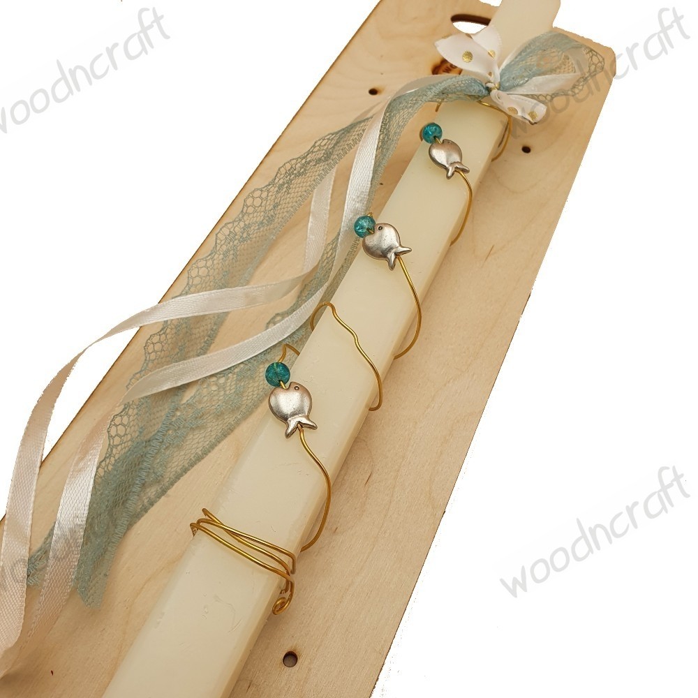 Πρωτότυπη χειροποίητη πασχαλινή λαμπάδα διακοσμημένη με χρυσό σύρμα με περαστές πέρλες, μεταλλικά ψαράκια, κορδέλες και δαντέλα! Μία όμορφη επιλογή για νεαρές κοπέλες!