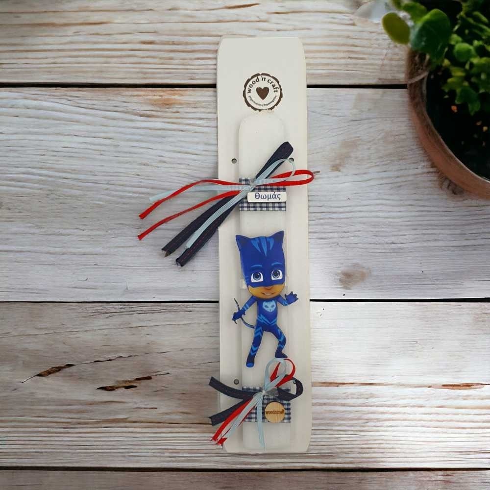 Πρωτότυπη χειροποίητη πασχαλινή λαμπάδα σε σετ με πλάτη που γίνεται καδράκι, διακοσμημένη με κορδελάκια, ταμπελάκι με το όνομα του παδιού και την φιγούρα του Κατμπόι από τους Πιτζαμοήρωες!