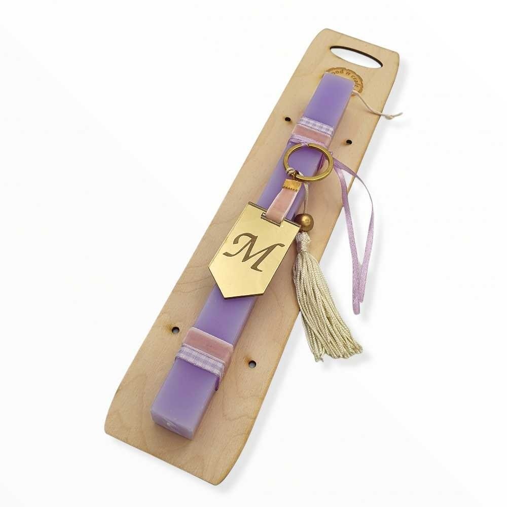 Πρωτότυπη χειροποίητη πασχαλινή λαμπάδα διακοσμημένη με κορδελάκια και προσωποποιημένο μπρελόκ από χρυσό καθρέφτη πλεξιγκλάς χαραγμένο με το μονόγραμμα της επιλογής σας και διακοσμημένο με βελούδινο λουράκι, επίχρυσο μεταλλικό κρίκο, χάντρα και κρεμαστή φούντα.